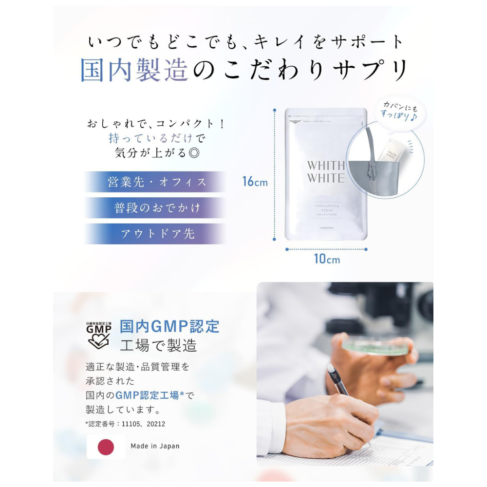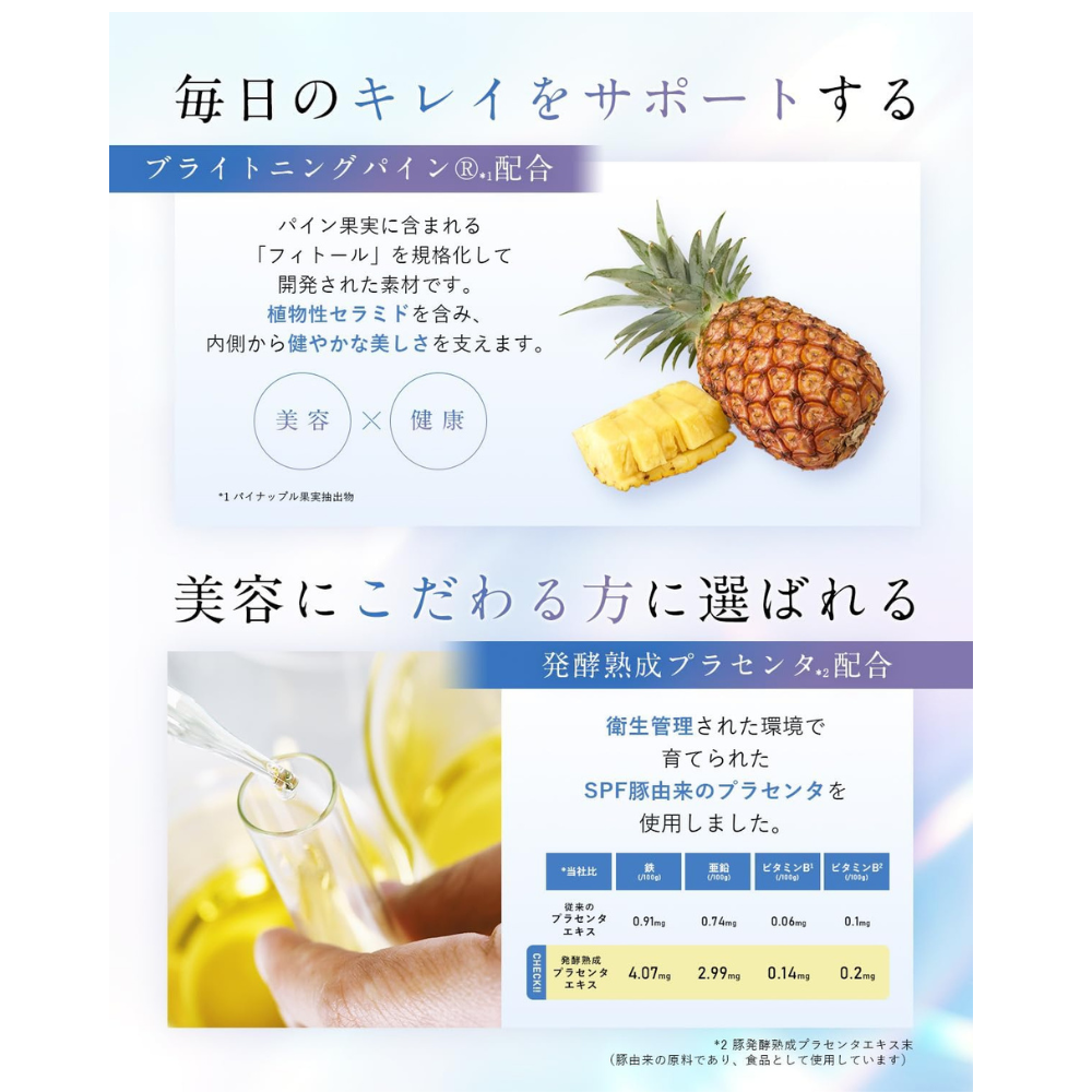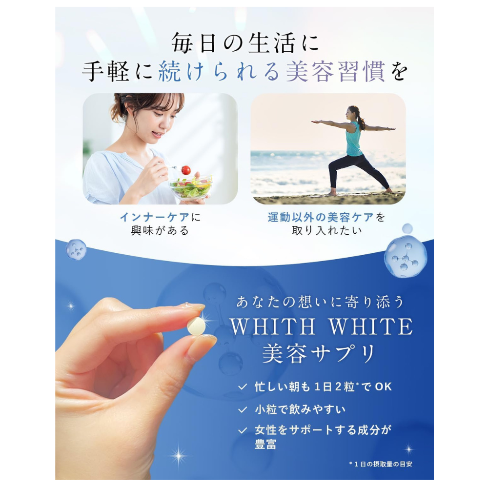 WHITH WHITE (Fisu White) هو مكمل ياباني للجمال الداخلي يحتوي على سيراميد من فاكهة الأناناس (الصنوبر المشرق)، ومشيمة الخنزير المتخمرة، وكولاجين السمك، وإيلاستين البونيتو - جميعها مكثفة في كبسولتين فقط سهل البلع يوميًا. مصمم ليكمل روتينك اليومي للعناية بالبشرة من خلال دعم الجمال من الداخل. صُنع في مصنع معتمد من GMP في اليابان. يتم الشحن مباشرة من اليابان.