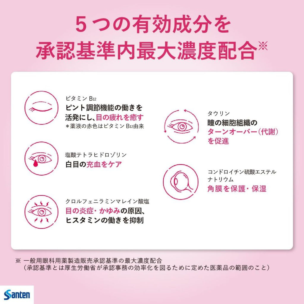 Sante Beauteye premium eye drops with taurine and rose-tinted formula. Relieves fatigue while brightening eye whites. Luxurious Japanese care.